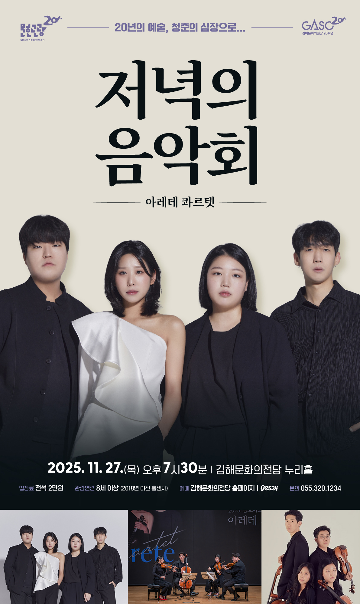 깊어가는 가을밤, 실내악의 정수를 전하는 ‘저녁의 음악회’가 김해문화의전당 무대에 오른다. 이번 공연에는 젊은 실내악 앙상블 ‘아레테 콰르텟’이 출연해 베토벤, 시벨리우스, 쇼스타코비치의 주요 현악사중주 작품을 선보인다. 아레테 콰르텟은 리옹 국제 실내악 콩쿠르에서 한국 최초 1위를 거머쥔 이후, 유럽과 국내 주요 무대에서 호평을 받으며 활동 중인 현악사중주단이다. 탄탄한 구성력과 섬세한 감정선이 돋보이는 연주는 클래식 애호가뿐 아니라 입문 관객에게도 깊은 인상을 남길 것이다.