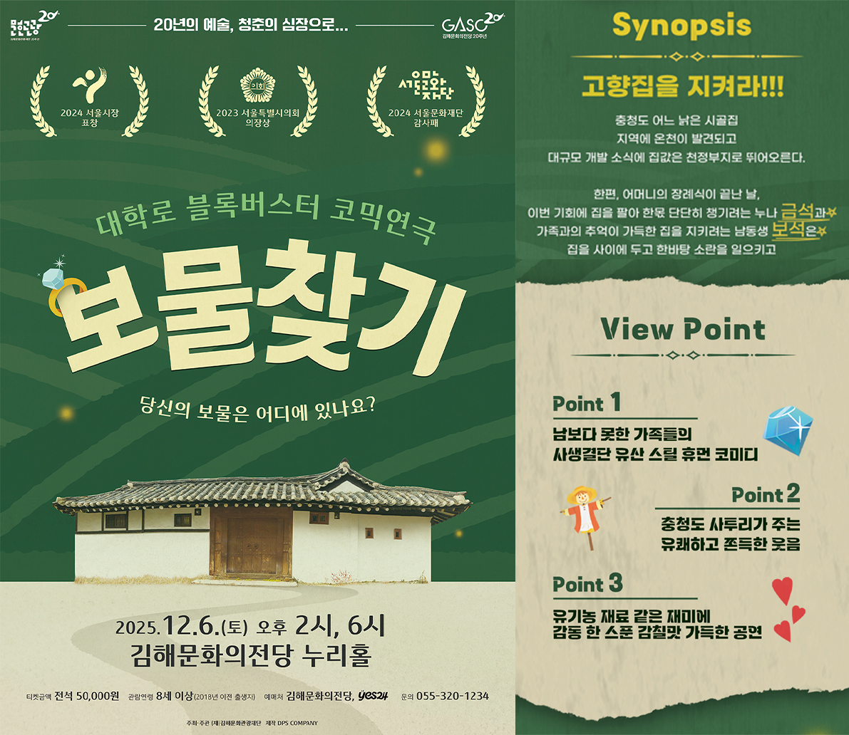 대학로에서 인기를 얻은 코믹 연극 <보물찾기>가 김해문화의전당 무대에 오른다. 충청도 시골집을 배경으로, 집을 지키려는 남동생 ‘보석’과 집을 팔려는 누나 ‘금석’이 펼치는 유산 소동을 유쾌한 코미디로 풀어낸 작품이다. 어머니가 남긴 보물이 뜻밖의 장소에서 발견되면서 상황은 점점 더 예측할 수 없는 방향으로 흘러가고, 남매의 티격태격하는 대립 속에 가족의 의미도 자연스럽게 드러난다. 충청도 사투리의 생활 감성과 재치 있는 에피소드가 어우러져 관객에게 꾸준한 웃음을 전한 작품으로, 남녀노소 누구나 가볍게 즐기기 좋은 공연이다.